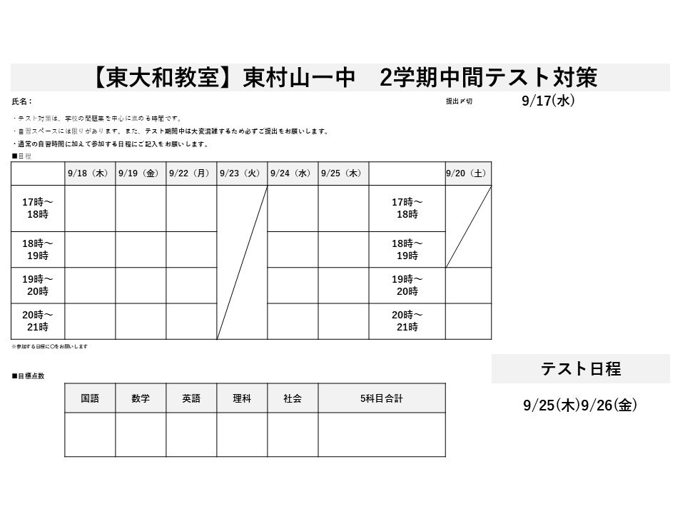 ■9/12(金)東村山一中のテスト範囲が配布されました!!導育塾【東大和】数学・英語の専門性が高く、一人ひとりに向き合りに向き合う進学塾、導育塾 東大和教室、東村山一中のテスト範囲が配布されました!!、1問でも解ける問題を増やし、「目指せ!、過去最高得点」!!、一緒に頑張りましょう!!