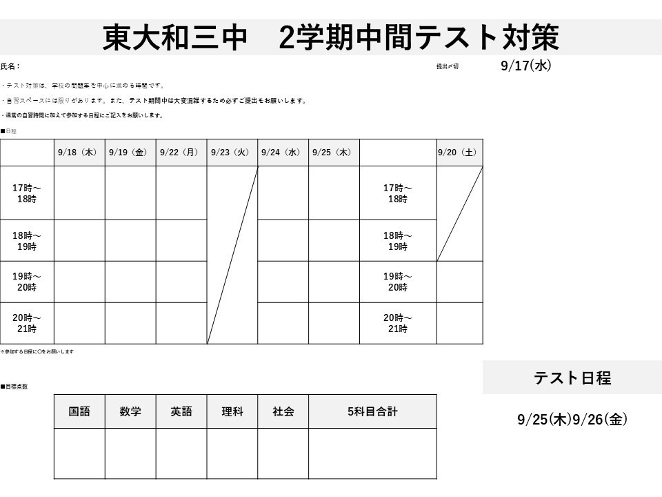 ■9/9(火)東大和三中のテスト範囲が配布されました!!導育塾【東大和】数学・英語の専門性が高く、一人ひとりに向き合う進学塾。導育塾 東大和教室、東大和三中のテスト範囲が配布されました!!、いよいよ、2学期中間テストに向けて動き始めます!!、目指すぞ!!、過去最高得点!!