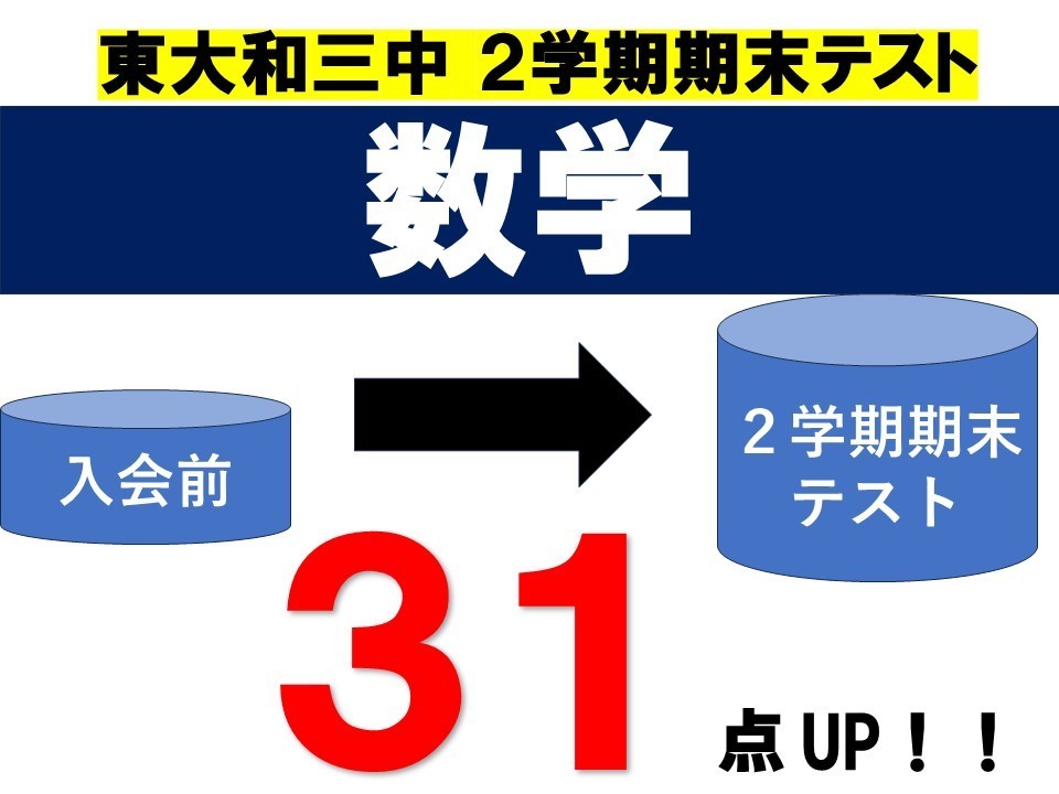 ■11/27(木) 東大和三中の期末テスト「数学31点UP!!導育塾【東大和】数学・英語の専門性が高く、一人ひとりに向き合りに向き合う進学塾、導育塾 東大和教室、すばらしい!!、東大和三中の数学のテスト結果が「31点UP」を実現!!、苦手だった数学、、、本当によく頑張りました!!