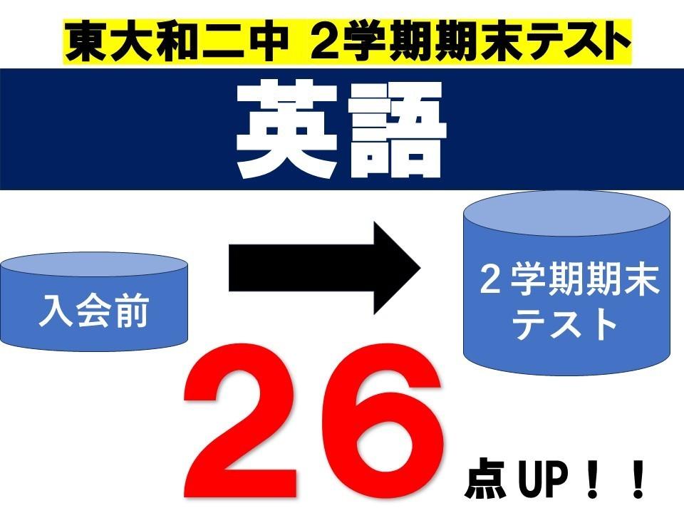 ■11/20(木) 東大和二中 2学期期末テスト「英語26点UP!!導育塾【東大和】数学・英語の専門性が高く、一人ひとりに向き合りに向き合う進学塾、導育塾 東大和教室、すばらしい結果です!!、東大和二中の期末テスト「英語26点」UP!!、よく頑張りました!!